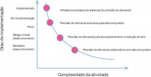 A Figura 1, representa a média das respostas dos fornecedores sobre o nível de implementação de atividades relacionadas à previsão de demanda. Nota-se que atividades mais simples, como a disponibilidade de uma infraestrutura básica de previsão de demanda, estão em nível mais avançado de implementação do que outras atividades mais complexas nesta área da logística. Enquanto que, em média, fornecedores exibem uma infraestrutura básica de previsão de demanda em fase de implementação, a previsão de demanda exclusiva para o varejista ainda se encontra em plano piloto.