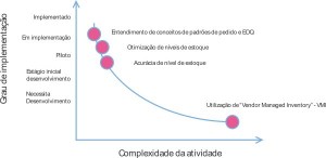 O mesmo padrão observado se repetiu em outras dimensões das operações logísticas na amostra. Ficou evidente nos resultados que as atividades ligadas à colaboração estão em fase de implementação menos avançadas que as demais. Com relação ao controle de estoque, por exemplo, a quase maioria dos participantes respondeu que entende os conceitos de EOQ (Economic Order Quantity) e padrões de pedidos e reabastecimento, e tais processos estão, em média, em fase de implementação. Em geral, os processos de otimização de estoque estão ainda em fase piloto, enquanto a acurácia do nível de estoque nos sistemas ainda não é a ideal.